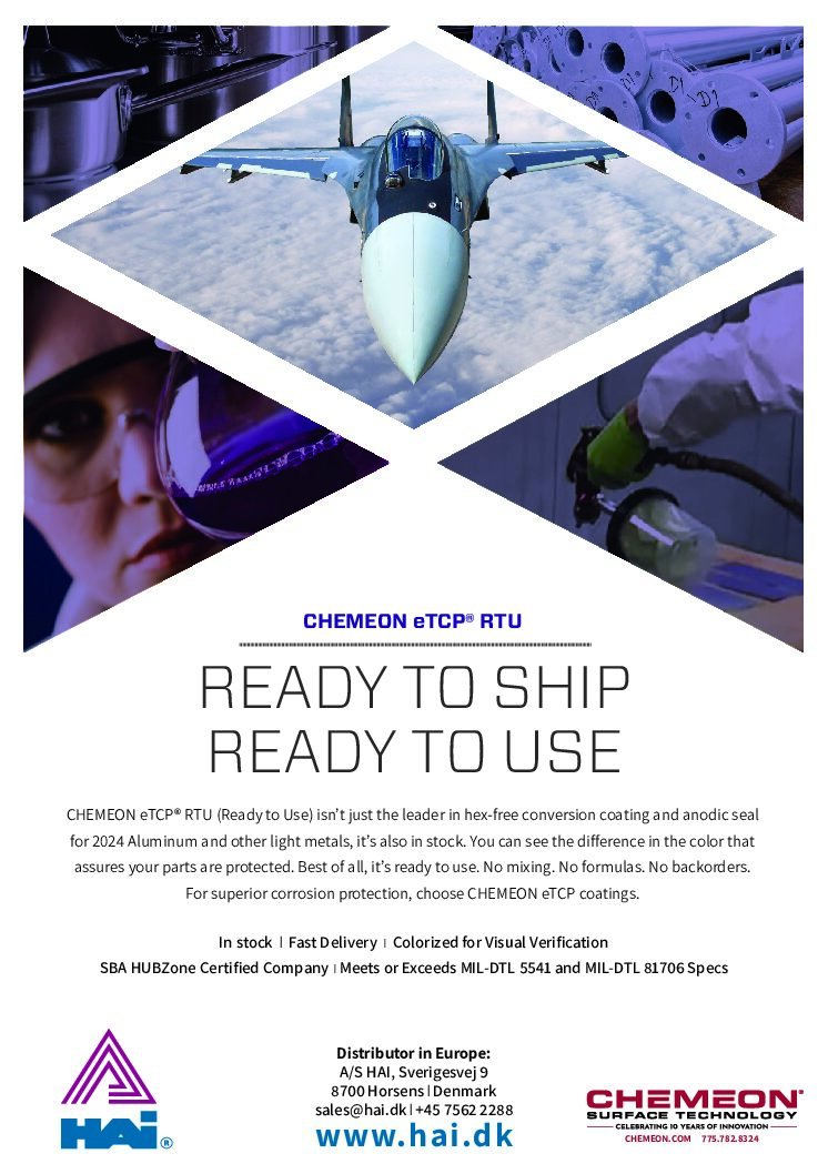 With CHEMEON eTCP®, you get a safe corrosion protection approved to MIL-DTL-5541F and MIL-DTL-81706B for use as a conversion coating on all aluminum alloys and other light metals.