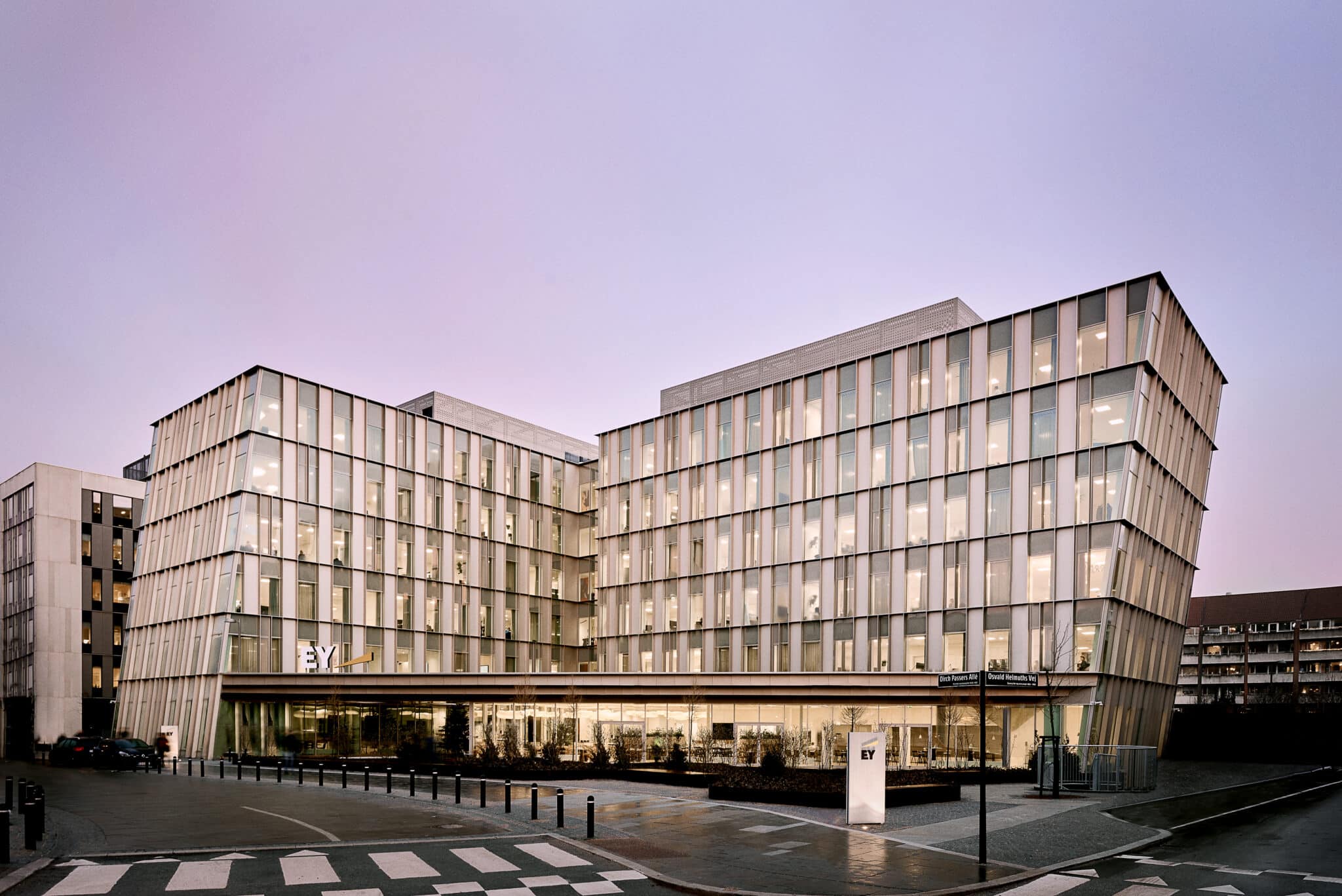 EY's head office in Denmark is located at Flintholm in Frederiksberg. The building has been realized with a focus on sustainability and beautiful design. The facade is light and almost crystalline in its appearance due to the interaction between glass and bronze-coloured aluminium, which creates a rhythmic flow through the entire architecture. The residence is a good example of how beautiful and easy a large building can look when combined with the right materials.