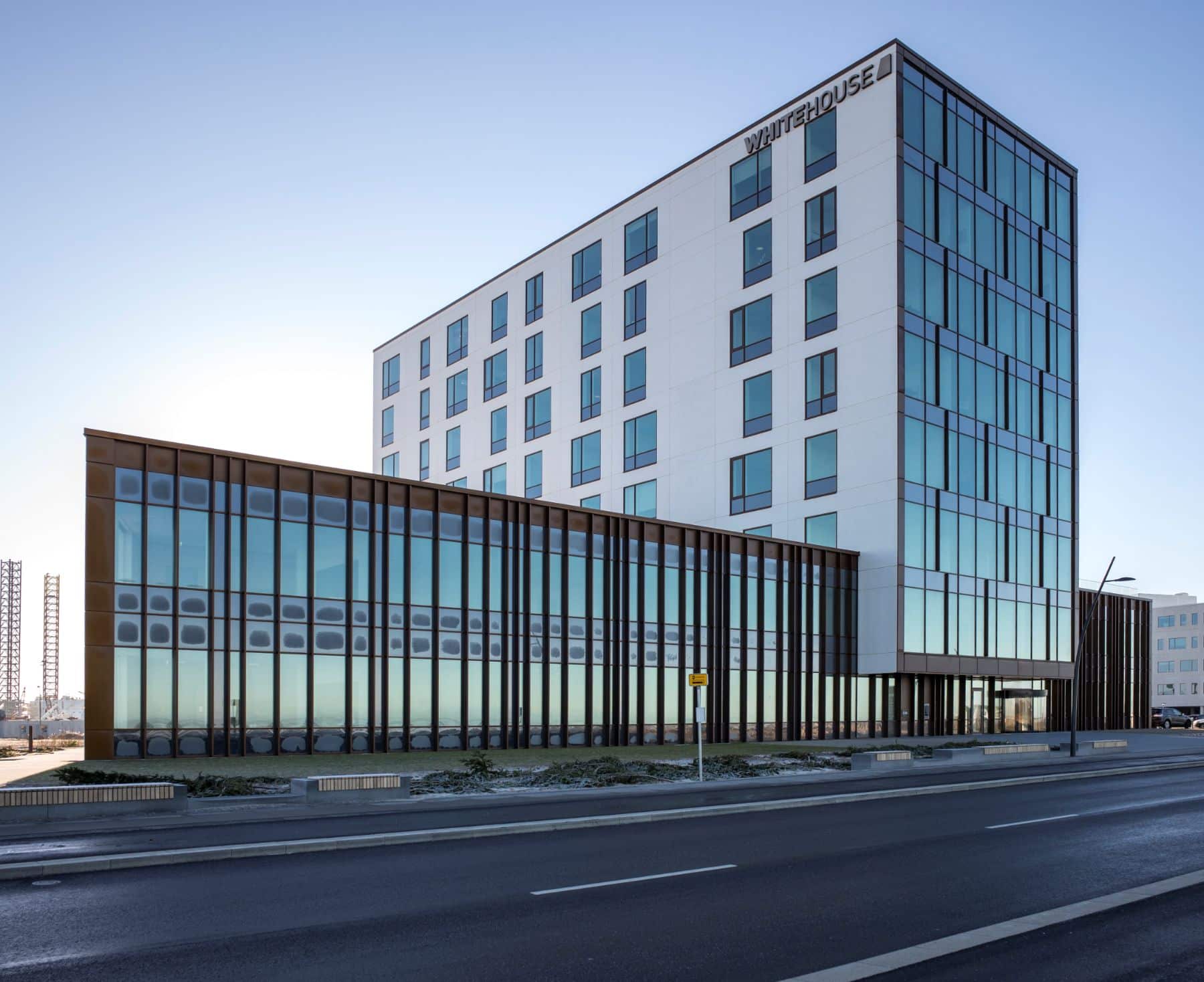 The White House is a commercial building that is designed by the architects Friis & Moltke. The cruciform building consists of an 8 storey and a 2 storey section with large glass sections, and with strong references to ship materials. The location on Esbjerg's harbor front with associated aggressiveness weather conditions place great demands on the building corrosion resistance and robustness. For the same reason, aluminum slats and bars made in a particularly corrosion resistant anodizing i the special color HAI® Court.