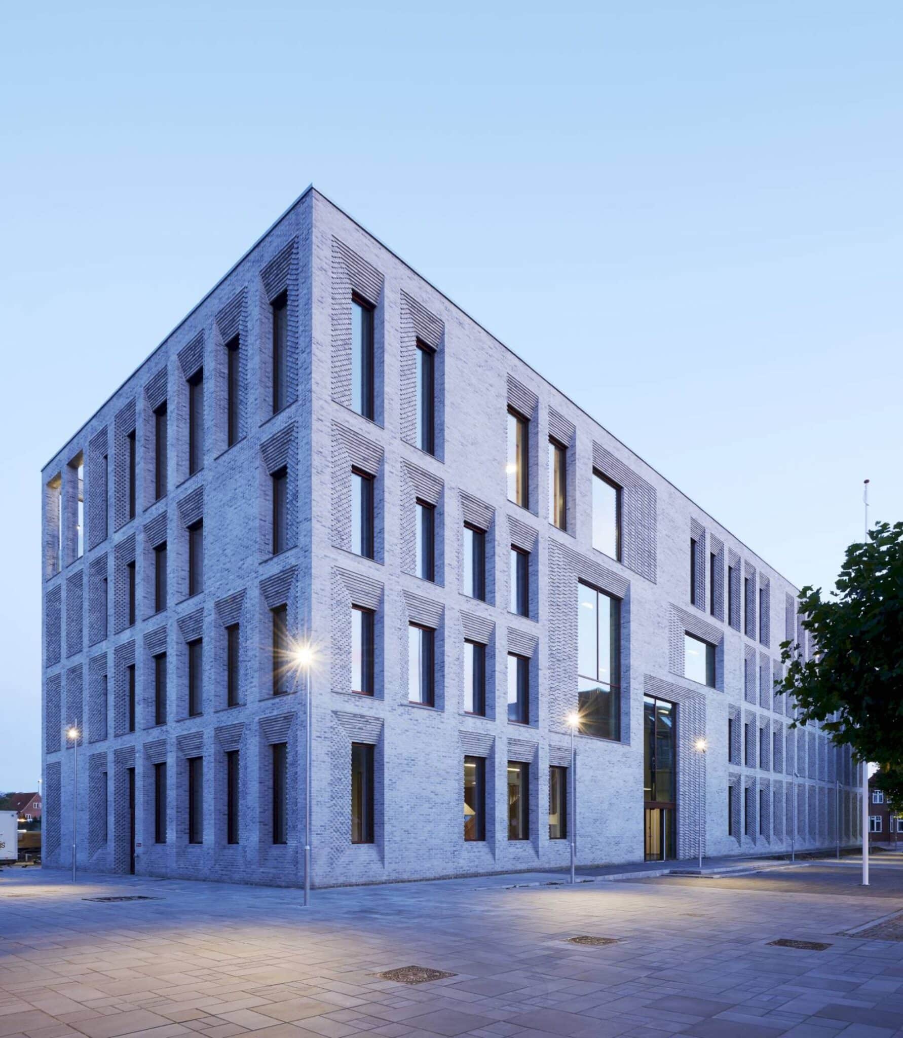 The building facade is made of light grey bricks in a relief design where the windows are pulled back in the slanted, chamfered clearings. In contrast to the brick construction is the window frames and others aluminum elements anodized in one deep HAI® Cuprum color. The retracted windows combined with the darker aluminum frames help to give a nice 3D effect.