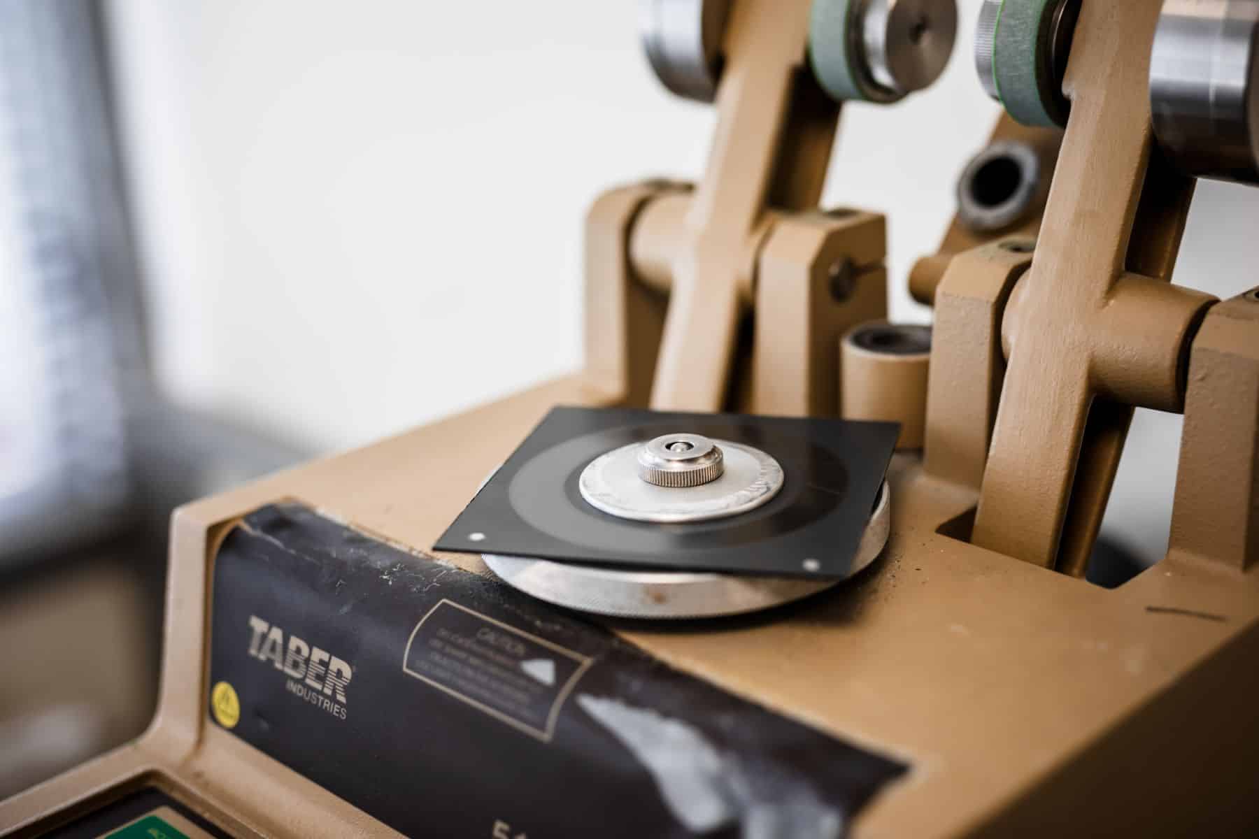 In connection with internal control and testing prevails HAI over a "Taber Abraser". Abrasion tests are performed as described in ISO 8251 and ASTM D4060. HAI® can therefore offer Taber wear resistance testing according to ISO 10074 and MIL-PRF-8625, type III and Qualanod's hard anodizing segment.